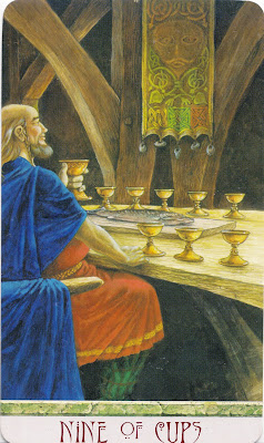 The last draw of the week with Druidcraft Tarot (Carr-Gomm & Worthington) yields the 9 of Cups. It offers an interesting perspective on the card image. In the traditional RWS, we see a portly, self-satisfied looking fellow posing as for a portrait before a draped display surface on which are arrayed his collection of 9 golden chalices. But in this 9 of Cups, the man is sitting on his own at a banquet table laid out with nine cups and a fish. Is he alone in the banqueting hall? There's a tapestry across the hall that has a face on it which reminds me a bit of the Gundestrup Cauldron. I like the way it is weighed down with hagstones at the bottom. :) I can't help but notice the very dark space under the table by the man's feet, and wonder what could be lurking there. My eye seems to be continuously drawn to it this morning. And is the man looking at someone approach from the other side of the hall? Or is he imagining someone is there? Or does he just not care that no one else is there?